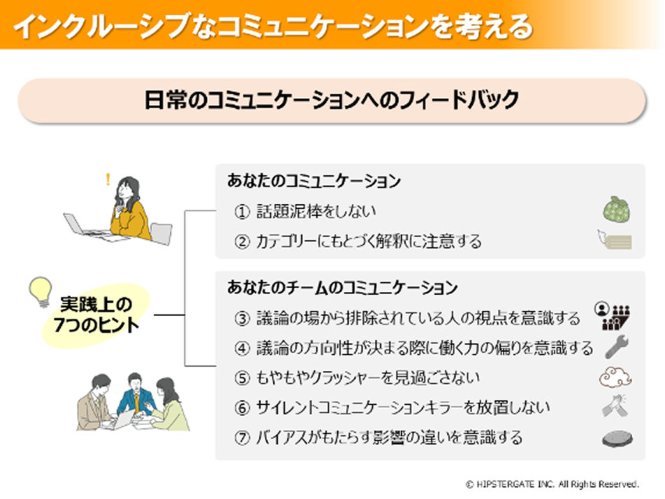 インクルーシブなコミュニケーションを実践するための7つのヒントは、日頃の自身の行動を振り返るのに大変役立つと感じました。どのような行動が適切なのか分かっていても、日々の業務に追われ意識が薄らいでしまっていることを再認識できました。